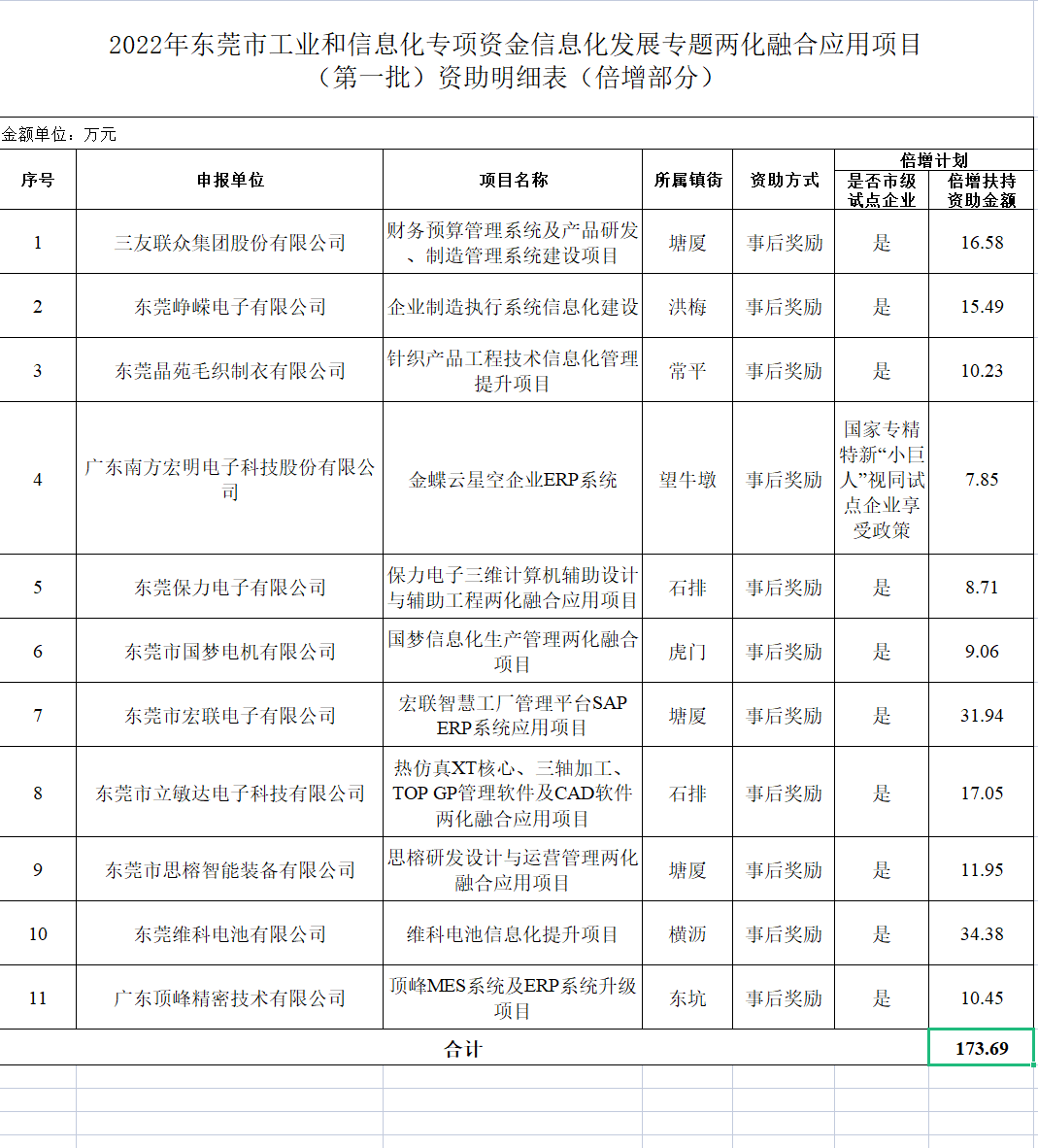 2. 2022年东莞市工业和信息化专项资金信息化发展专题两化融合应用项目(第一批)资助明细表(倍增部分)
