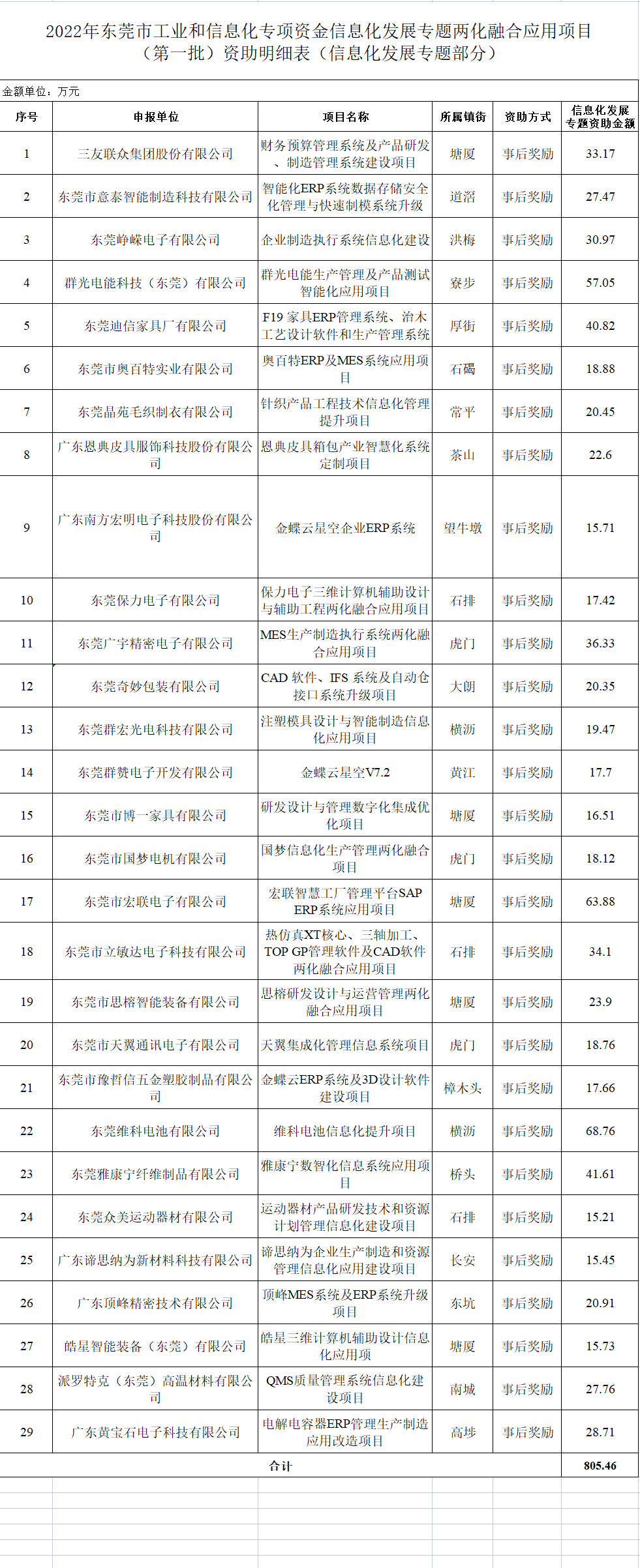 1.2022年东莞市工业和信息化专项资金信息化发展专题两化融合应用项目(第一批)资助明细表(信息化专题部分)