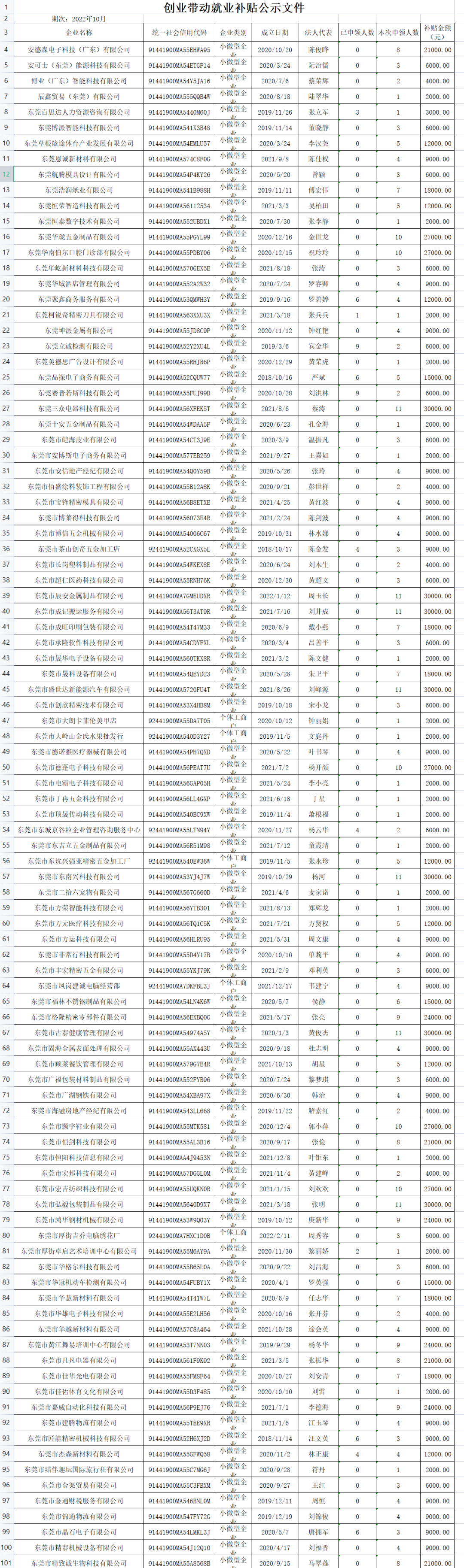 现将2022年10月审核通过的创业带动就业补贴申领情况进行公示 (内容详见附表),如公示名单中存在被证实不符合拨付条件的,将予以剔除,实际补贴发放情况以最终拨付名单为准。
