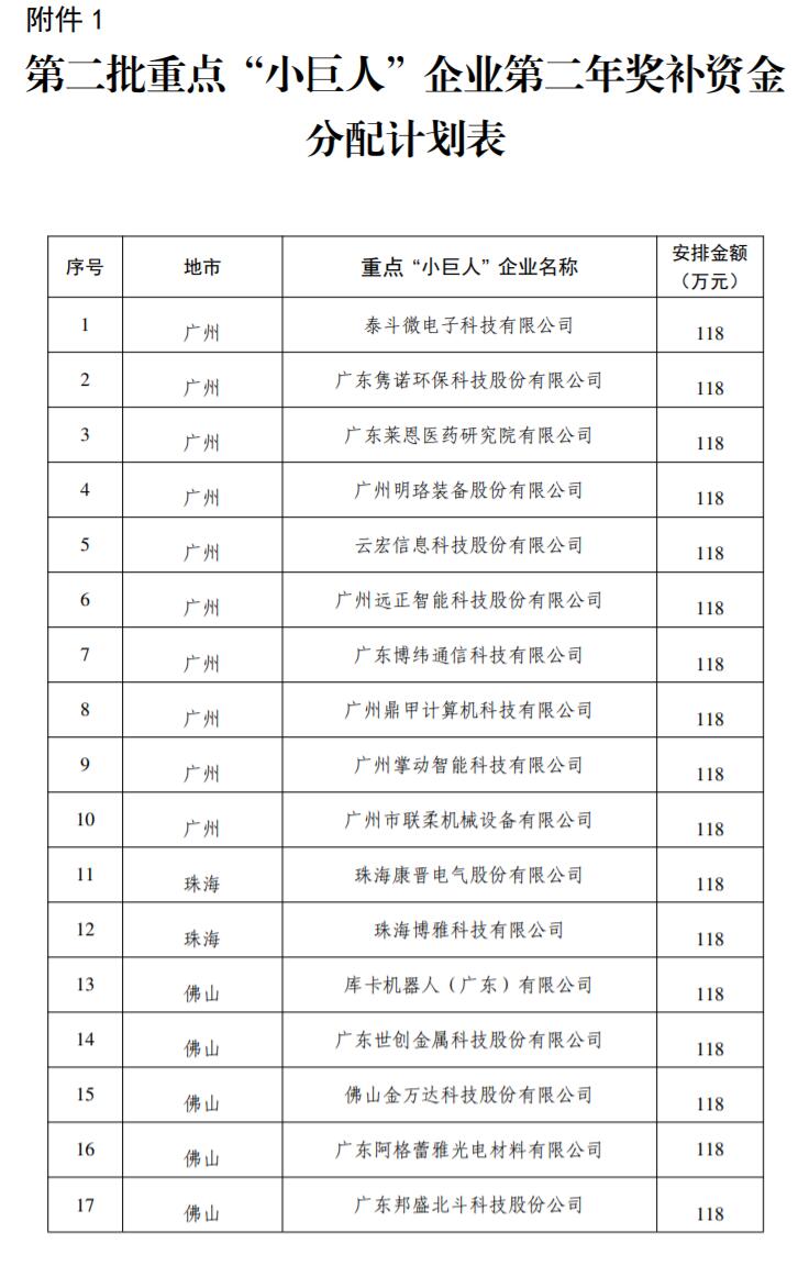 根据《广东省省级财政专项资金管理办法(试行)》(粤府〔2018〕120号)、《关于印发省工业和信息化厅经管专项资金管理办法的通知》(粤财工〔2019〕115号)等有关规定,现将中央财政支持第二批重点“小巨人”企业第二年奖补资金安排计划予以公示(见附件)。公示期自2022年11月22日至11月28日,共7天。对公示内容如有异议,请在公示期内向省工业和信息化厅反映。以个人名义反映情况的,请提供真实姓名、联系方式和反映事项证明材料等;以单位名义反映情况的,请提供真实单位名称(加盖公章)、联系人、联系方式和反映事项证明材料等。