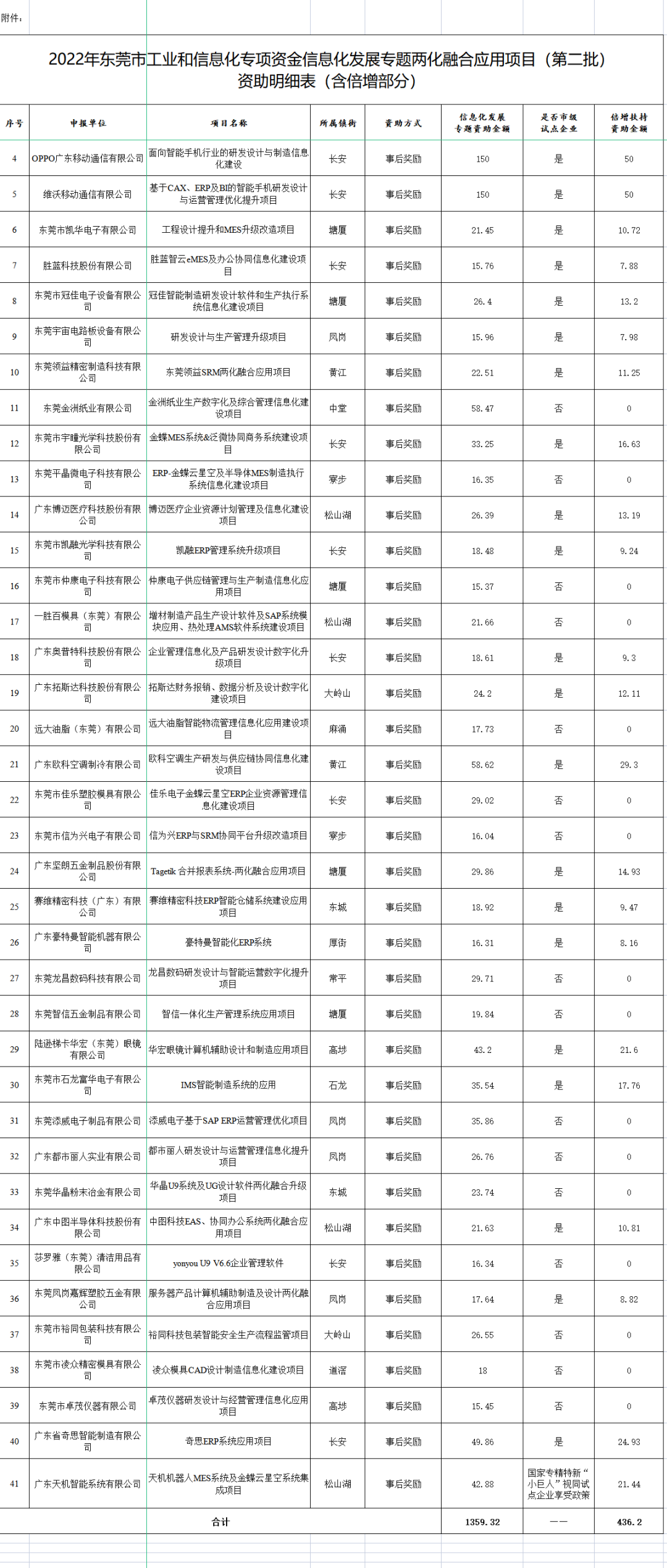 附件:2022年东莞市工业和信息化专项资金信息化发展专题两化融合应用项目(第二批)资助明细表(含倍增部分)