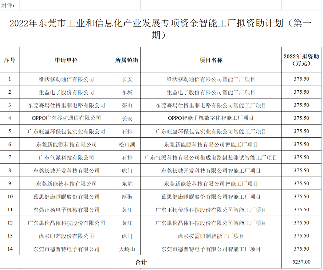 根据《东莞市工业和信息化产业发展专项资金管理办法》、《关于公布2022年东莞市工业和信息化局智能工厂(车间)项目入库名单的通知》、《关于申报2022年东莞市工业和信息化产业发展专项资金智能工厂资助项目的通知》的文件精神,东莞市工业和信息化局组织开展了2022年东莞市工业和信息化产业发展专项资金智能工厂资助项目资金申报工作。经网上申报、资格审查、形式审查等工作程序,结合2022年预算情况,现将《2022年东莞市工业和信息化产业发展专项资金智能工厂项目拟资助计划(第一期)》(详见附件)予以公示。
