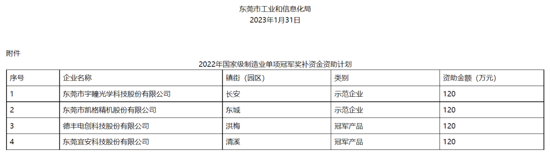 根据《广东省工业和信息化厅关于开展2022年国家级制造业单项冠军企业奖补资金申报的通知》(粤工信规划政策函〔2022〕37号)《广东省工业和信息化厅关于下达2022年国家级制造业单项冠军奖补资金安排计划的通知》(粤工信规划政策函〔2022〕47号)等文件要求,我局开展2022年国家级制造业单项冠军企业奖补资金申报工作,结合2023年省级预算安排,经过有关审核流程,现将资助计划(详见附件)予以公示。