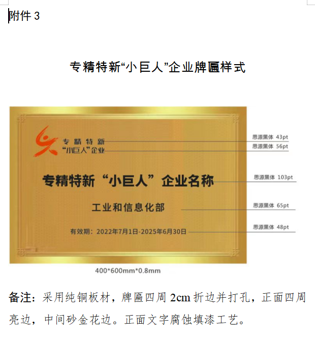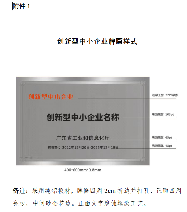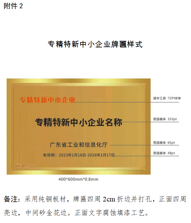 (一)广东省创新型中小企业、专精特新中小企业牌匾,由企业根据需要自行制作。