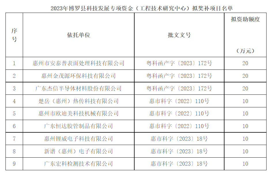 附件:2023年博罗县科技发展专项资金(工程技术研究中心)拟奖补项目名单