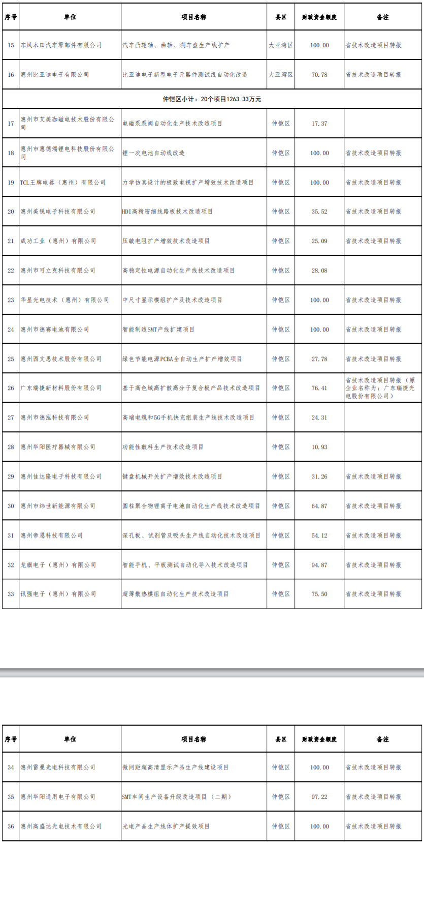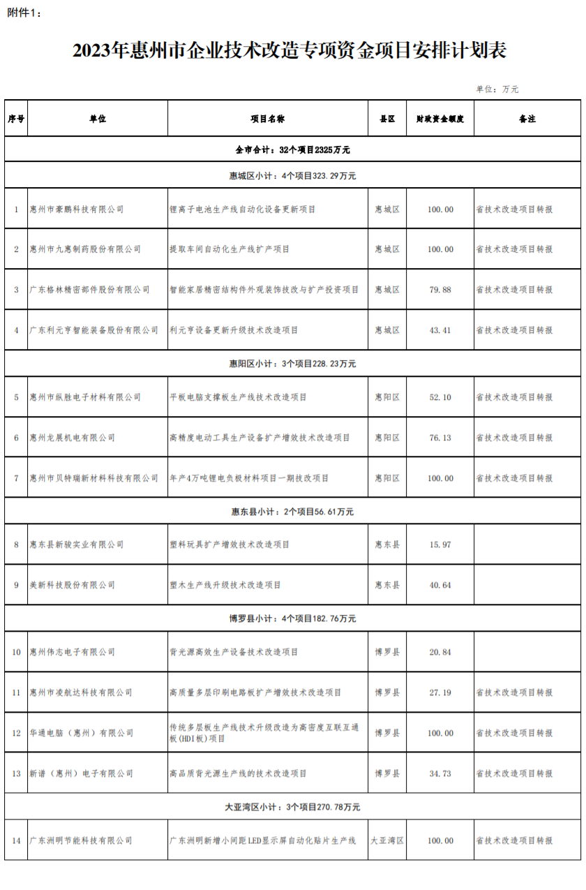 1. 2023年惠州市技术改造专项资金项目安排计划表