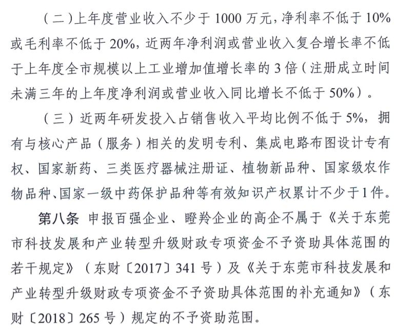 (三)申报企业应不在东莞市有关财政专项资金不予资助范围。