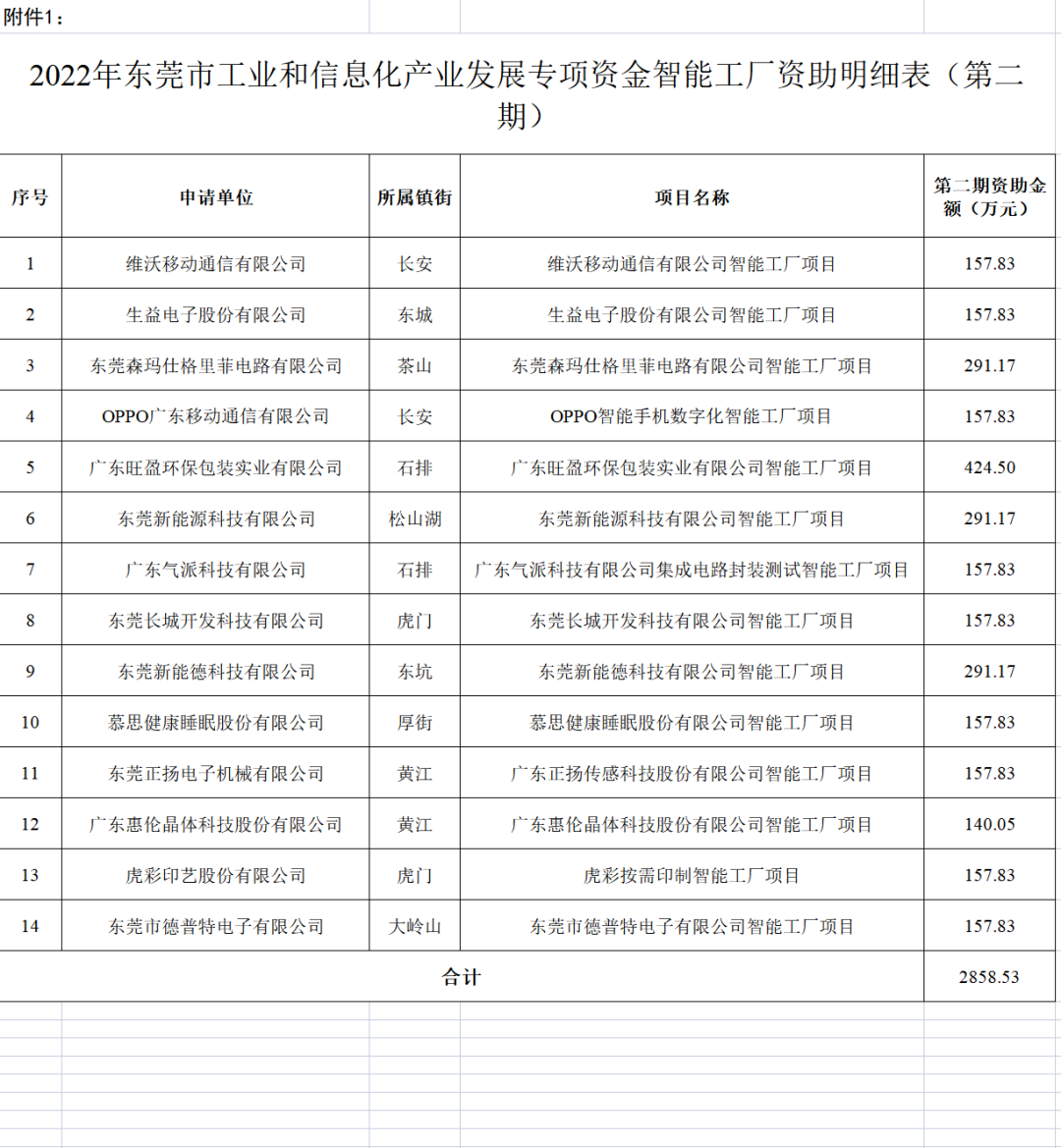 1.东莞市工业和信息化产业发展专项资金智能工厂(第二期)项目资金资助明细表