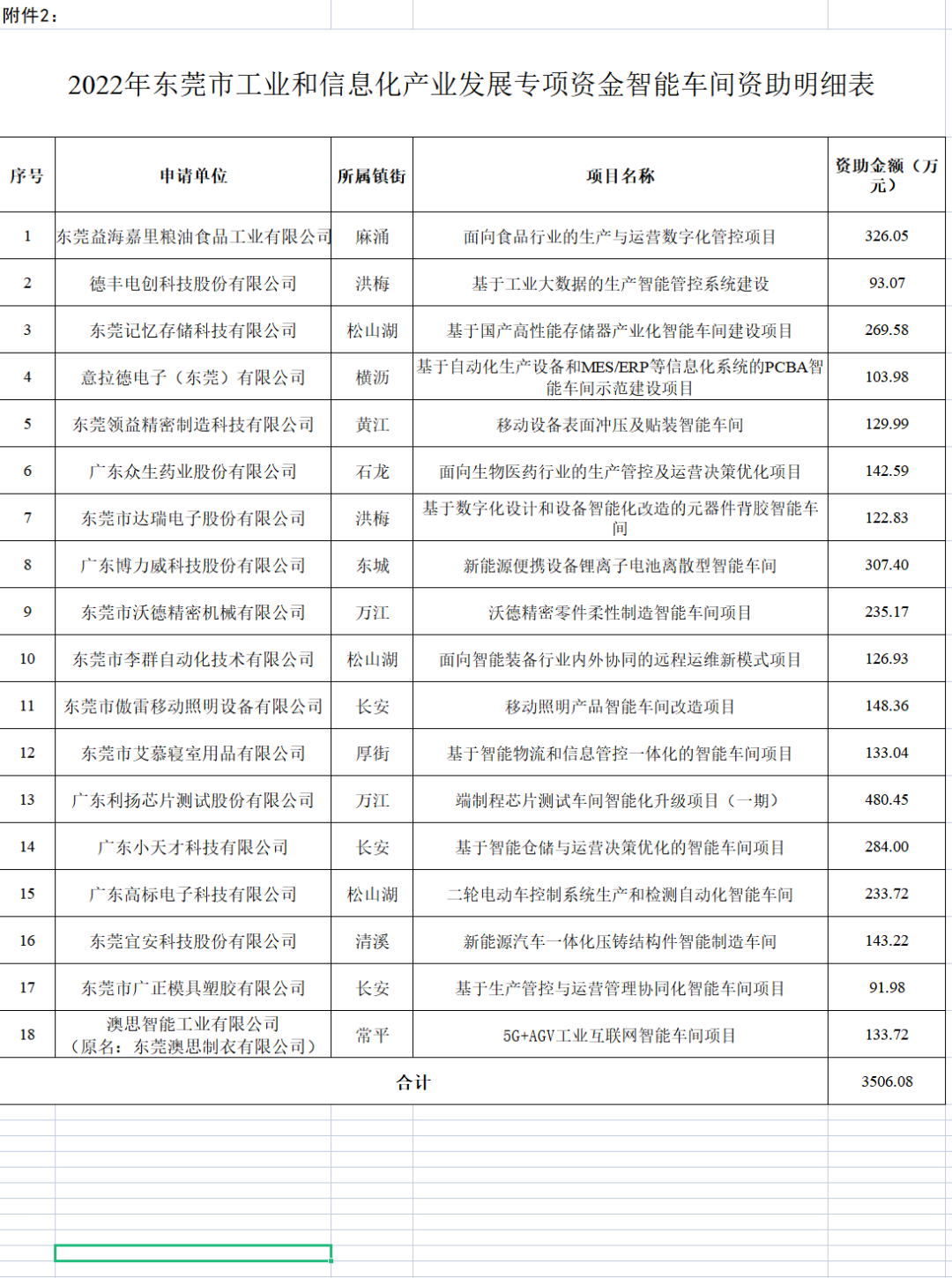 2.东莞市工业和信息化产业发展专项资金智能车间项目资金资助明细表