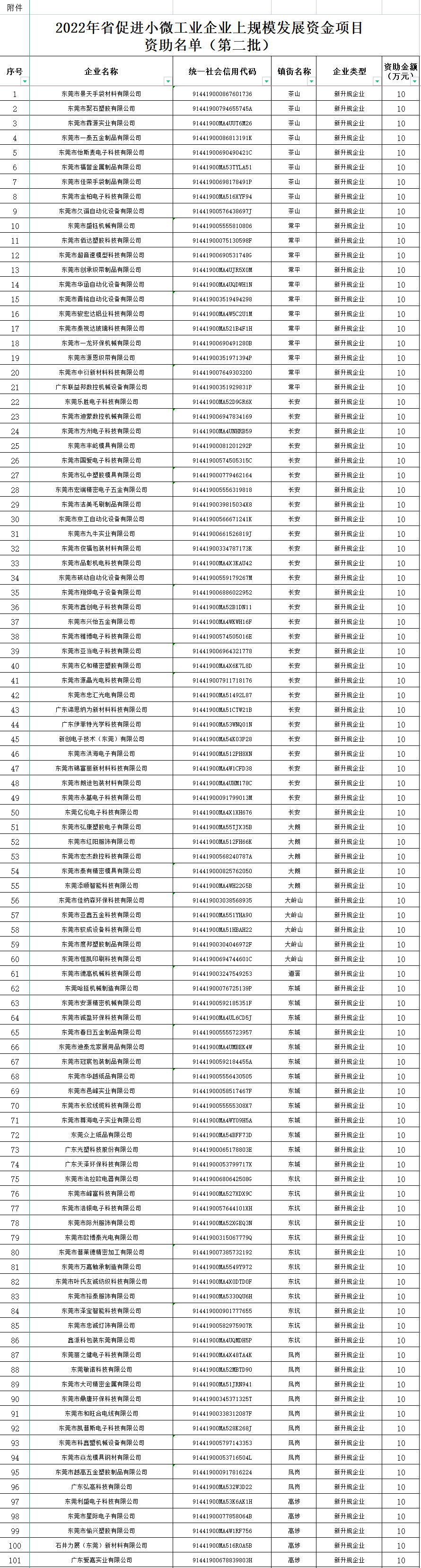 根据《广东省工业和信息化厅关于组织实施2022年促进小微工业企业上规模发展专项资⾦的函》(粤工信融资函〔2022〕42号)的有关规定,市工信局开展2022年促进小微工业企业上规模发展资金项目入库项目的申报工作。经市政府批复同意,现将第二批资助合计2520万元拨付至东莞市景天手袋材料有限公司等252家企业。请按照适用的会计准则、会计制度做好账务处理,执行中如遇问题,请向市工信局中小企业综合服务科反馈。