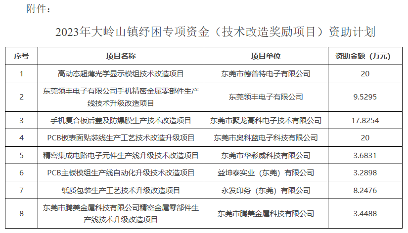 附件:2023年大岭山镇纾困专项资金(技术改造奖励项目)资助计划