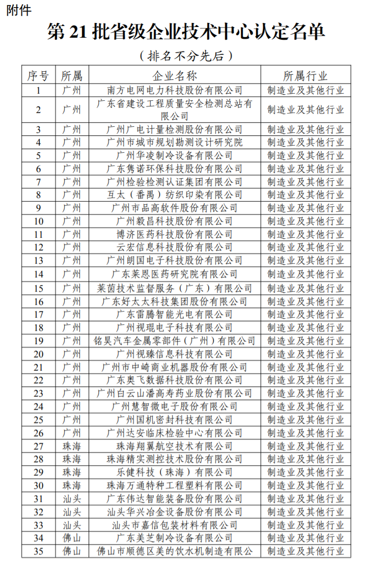 根据《广东省工业和信息化厅关于组织开展2022年省级企业技术中心(第21批)认定工作的通知》,经企业申报、各地级以上市工业和信息化主管部门推荐、专家评审等程序,初步确定了第21批省级企业技术中心认定名单,现予以公示。