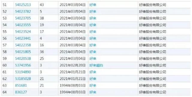 2021年初,好维公司就申请了“好来”大多数类别的商标,目前多显示为“已注册”、“初审公告”,少数类别仍处于“注册申请”中。