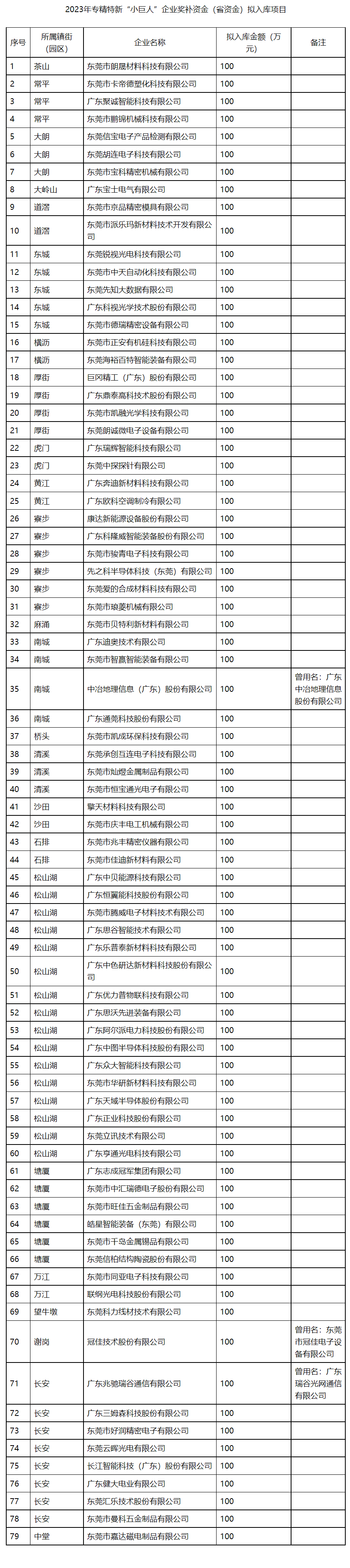 根据《广东省工业和信息化厅关于开展2023年专精特新“小巨人”企业奖补资金申报的通知》(粤工信融资函〔2023〕31号)要求,我局开展了2023年专精特新“小巨人”企业奖补资金(省资金)申报相关工作,经有关审核流程,79个项目列入入库计划,现对项目入库项目予以公示。