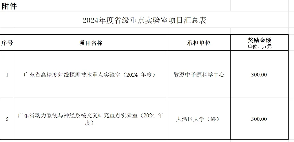 根据《东莞市科学技术局关于印发<东莞市研发机构建设资助管理办法>等建设国家创新型城市配套政策的通知》(东科〔2021〕57号)“对获得广东省重点实验室立项(认定)资助和绩效评估资助的,市财政按省级资助标准给予不超过1:1的奖励”的规定,拟对散裂中子源科学中心承担的广东省高精度射线探测技术重点实验室(2024年度)、大湾区大学(筹)承担的广东省动力系统与神经系统交叉研究重点实验室(2024年度)予以奖励,现将拟奖励项目向社会公示,公示期为10天。