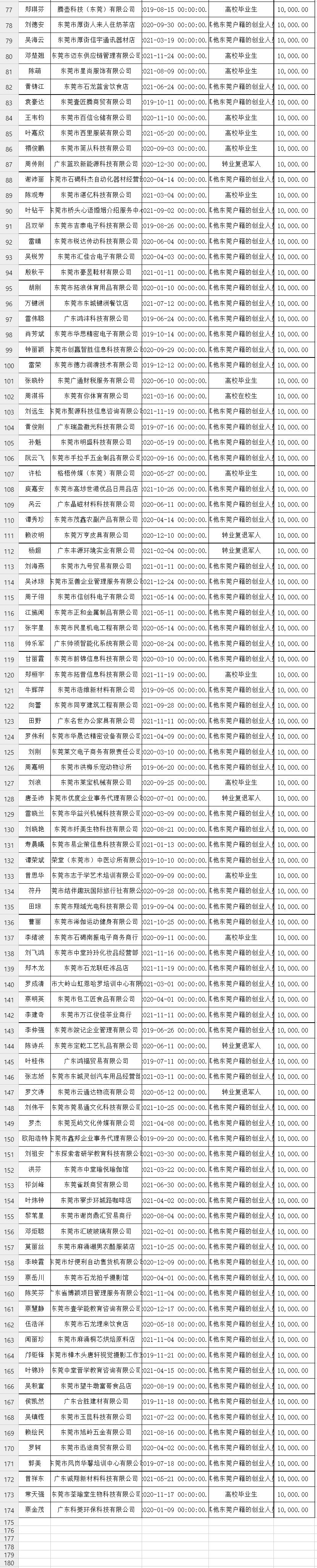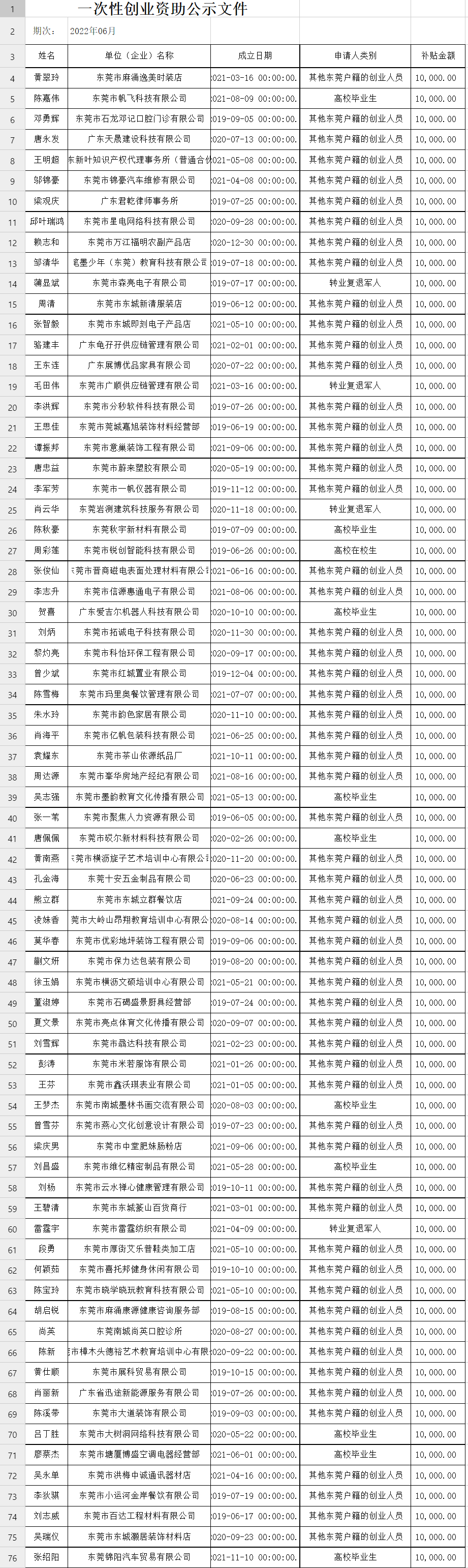 东莞市 创业补贴 2022年6月 一次性创业 资助公示