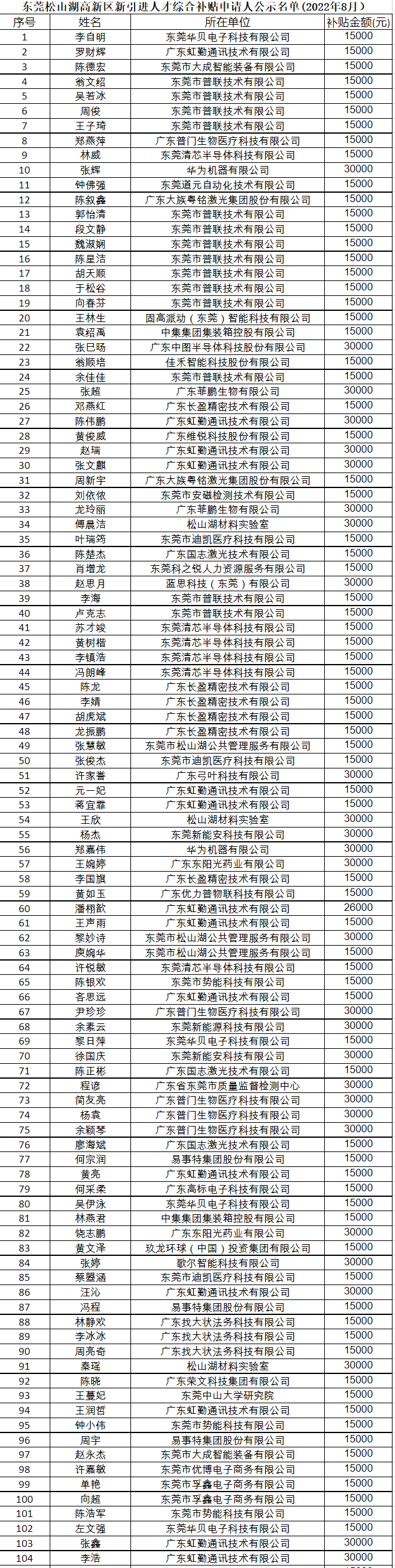 现将东莞松山湖高新区新引进人才综合补贴申请人名单予以公示。(见附件)