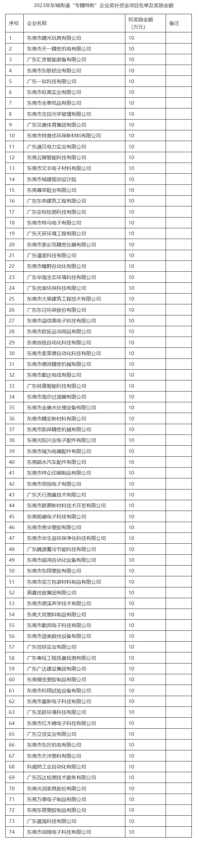 附件:2023年东城街道“专精特新”企业奖补资金项目名单及奖励金额
